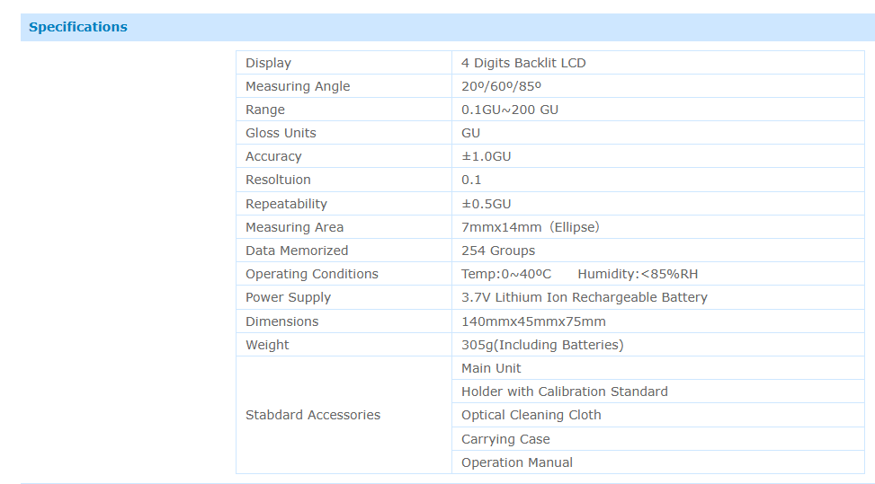 * In accordance with international standard ASTMD523, ASTMD1455, ASTMC346, ASTMC584, ASTMD2457, DIN ENISO2813, DIN67530, ENISO7668, JISZ8741, MFT30064, TAPPIT480, GB9754, GB/T13891, GB7706 and GB8807. Its technical parameters conform with JJG696-2002.