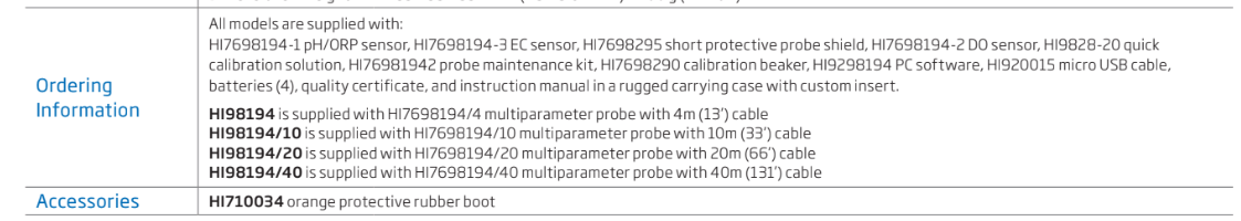 The HI98194 is a waterproof portable logging multiparameter meter that monitors up to 12 different water quality parameters including 6 measured and 6 calculated. The microprocessor based multi-sensor probe allows for the measurement of key parameters including pH, ORP, conductivity, dissolved oxygen, and temperature. The probe transmits readings digitally to the meter, where data points can be displayed and logged. The HI98194 is supplied with all necessary accessories and packaged in a durable carrying case.